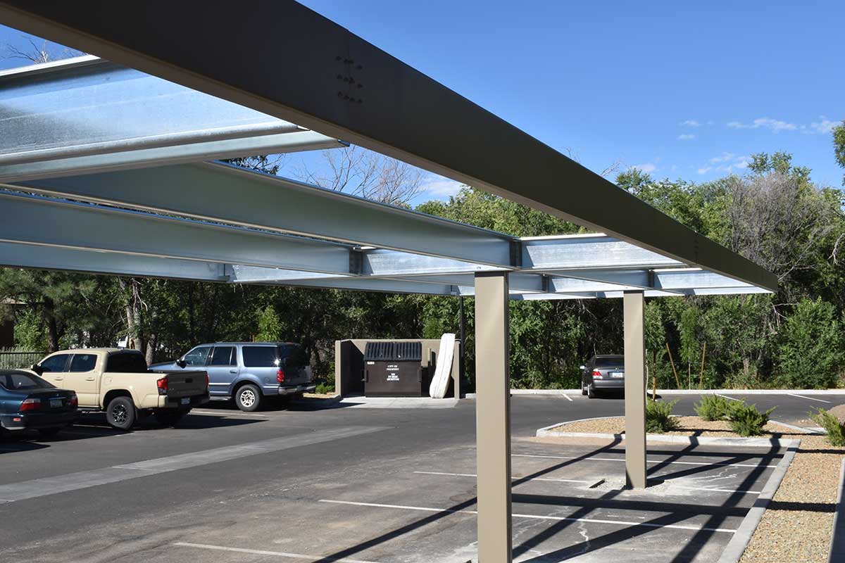 • Carports can be ordered in most any configuration from 2 spaces to 100 or more. In the above photo you can see three separate cantilever kits installed here. There is an 8-space kit nearest. A six-space kit second from front, and a 4-space kit in the back.  The 4 and 6 space kits are built adjacent to one another and allow for sloping of the ground.