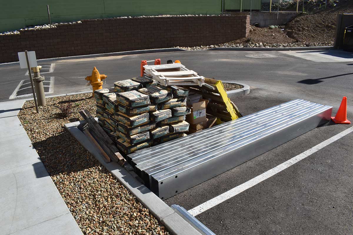 Above:  In addition to the mounds of dirt and cones marking the build area, this builder covered the holes  with plywood and then put a heavy frame part over the top of that.  This is an apartment property that is occupied, so they had to make sure things were safe for the kids and other tenants.
