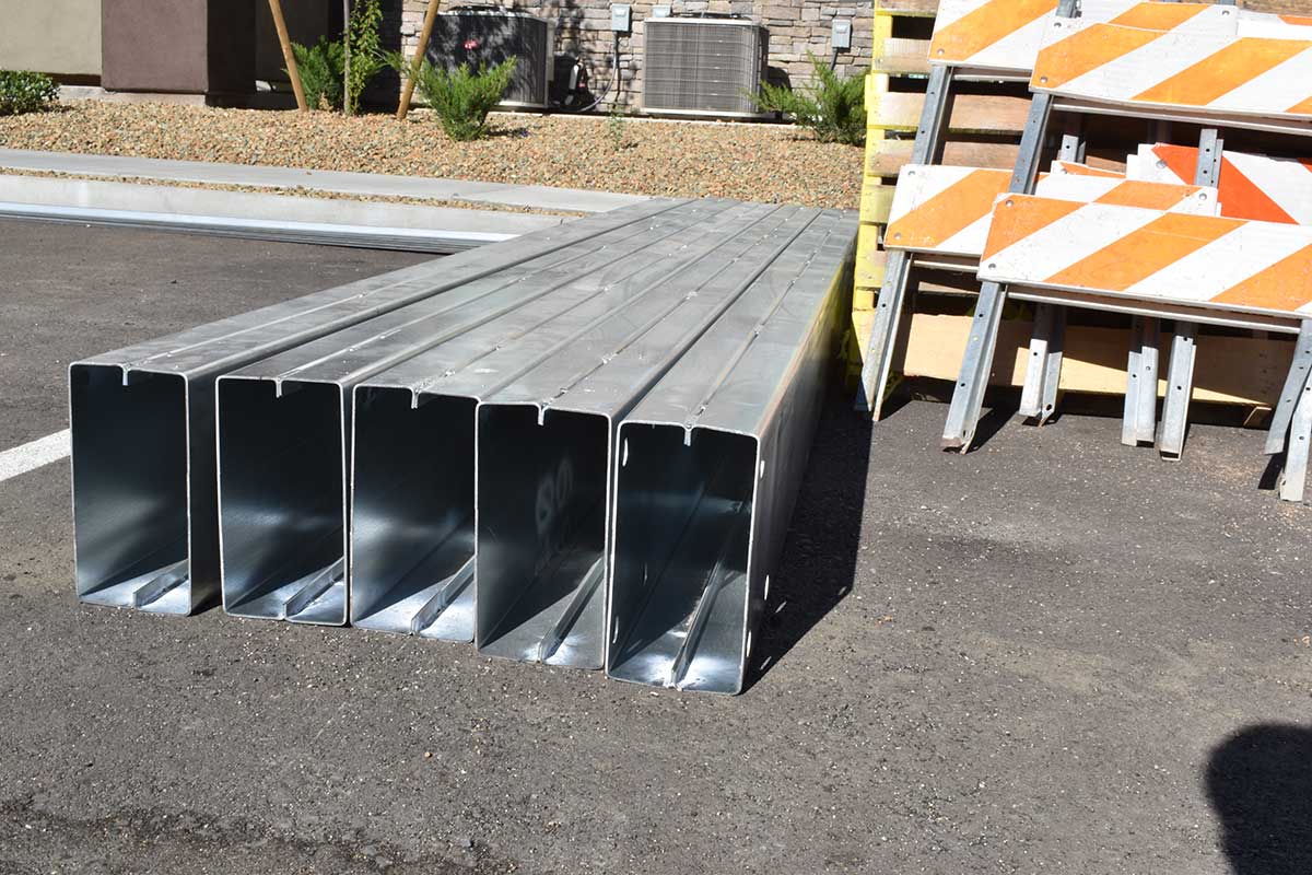The key to correctly install your cantilever carport is to get the columns set right.  If you can build a backyard fence you can assemble a cantilever carport system  – “semi or full cant”. Your columns have to be  lined up with one another and there’s simple ways and hard ways to do that. Below is an 8-space system utilizing four columns.  NOTE: This is a different project than the above apartment parking project and is added here for benefit of example. On this job the column hole cutouts were made before the pour of the slab using round Sonotube. If installing after the slab is already poured, you can come in after the pour and saw cut a square (as in the installation project above). Either way you must have access to native grade so you can penetrate down the required depth.